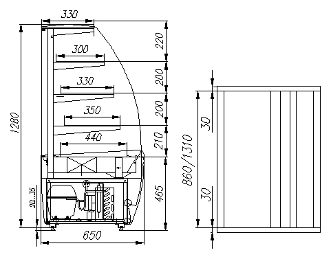 Модель оснащена прямыми боковыми и гнутым передним стеклом, что улучшает обзорность и внешний вид продукции. Задние раздвижные створки выполнены из лёгкого и прочного оргстекла. Конструкция корпуса из стали и изоляция из пенополиуретана обеспечивают надёжную термозащиту. Пластиковые боковины делают витрину визуально лёгкой и современной.