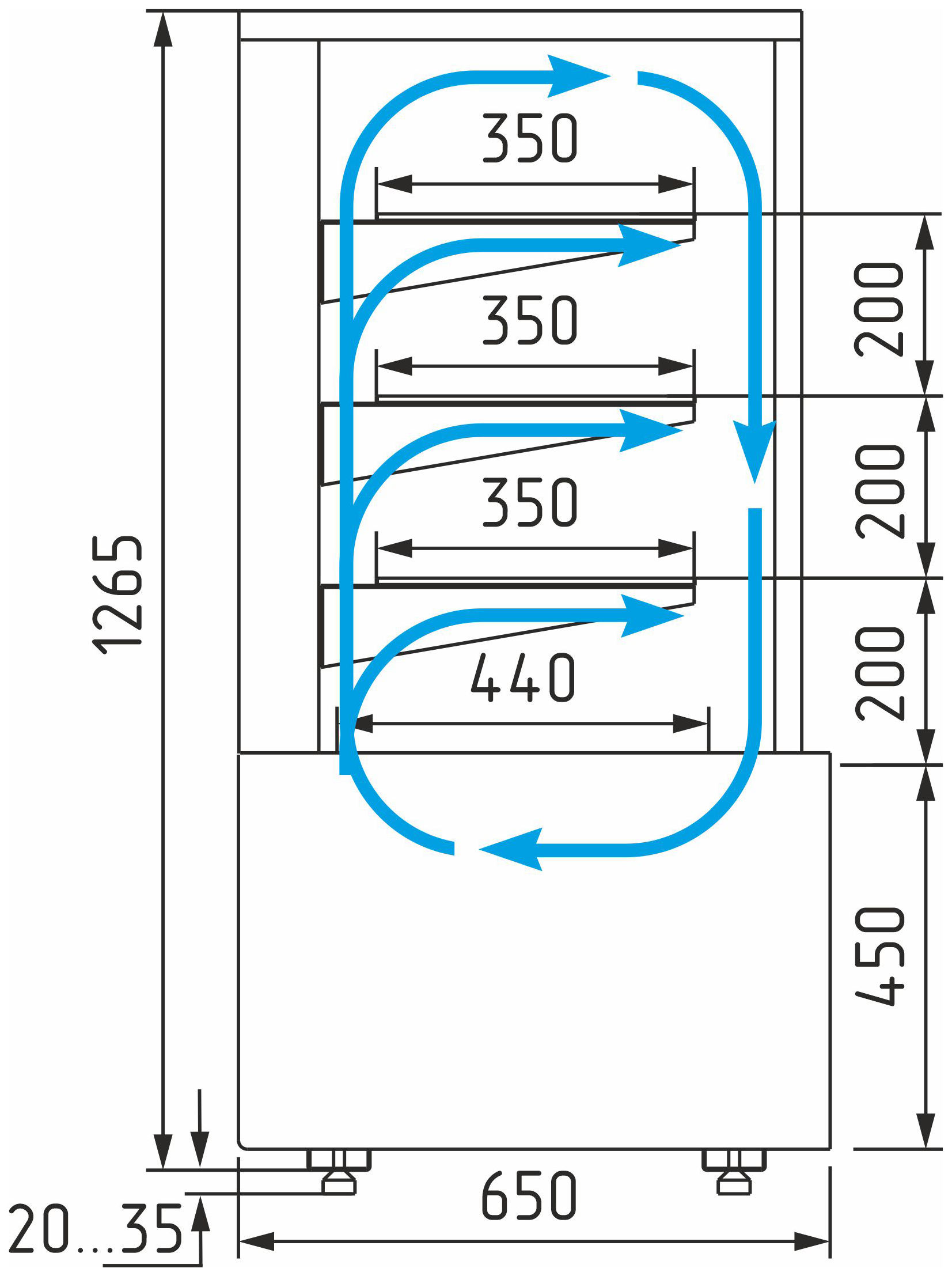 Размер полок: 860×350 мм, нижней зоны выкладки – 860×440 мм