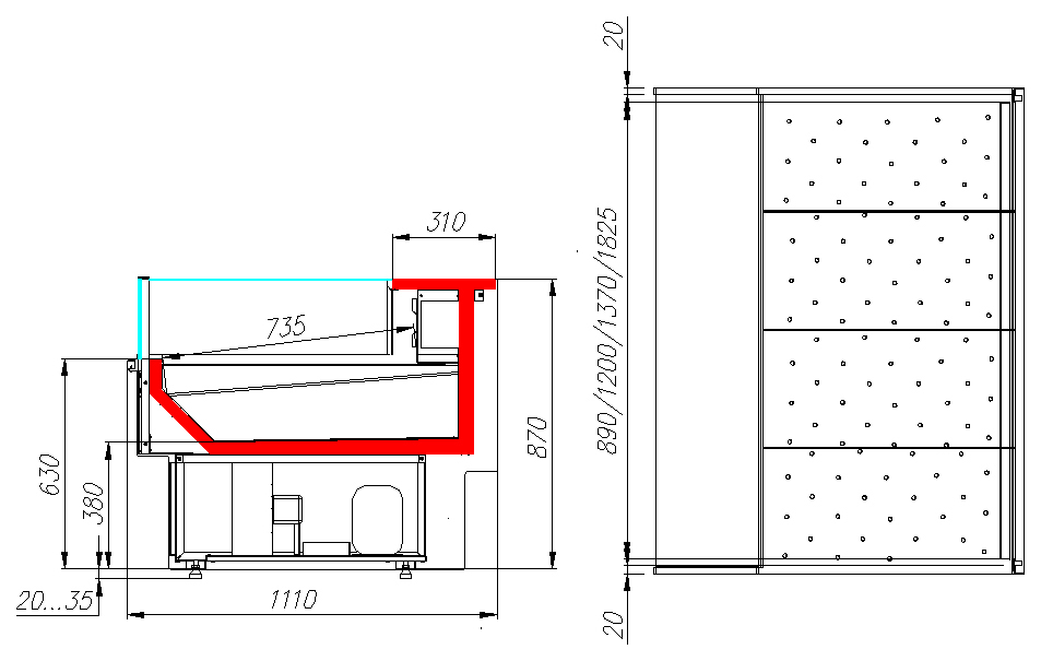 Конструкция оснащена регулируемыми ножками (20–35 мм) для удобной установки. Поверхность выкладки и столешница выполнены из шлифованной нержавеющей стали, передняя панель — из окрашенной в серый цвет стали, боковины — из прочного пластика.